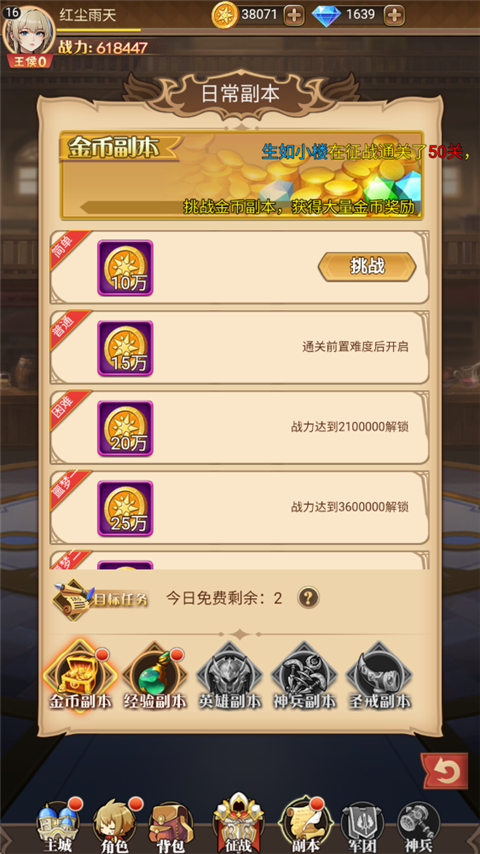 2、每日可在副本中挑战日常副本、参与各种玩法可获得各种收益。