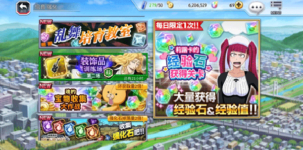 玩家可以通过消耗同稀有度同名人物或消耗必杀技的秘诀来提升必杀技等级。必杀技的秘诀共两种:特定属性的必杀技的秘诀(知、力、技、速、心)只能强化相同属性的人物以及必杀技的秘诀(虹)可用于强化任何属性的人物必杀技。同稀有度同名人物则意味着被消耗角色的属性、稀有度、名字都需与基底角色相同,等级无要求,比如:消耗1级5星黑崎一护可以使100级5星黑崎一护的必杀技等级从1升级为2。