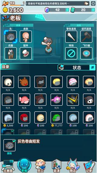 4、在老板界面可以为老板进行各种装扮,同时还可以装备各种警告道具,当然这些道具都不是免费的,需要你积攒足够的金币才可以获得哦。