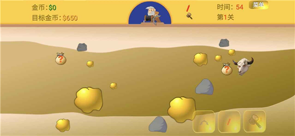 3、之后你就正常抓金矿,点击右下角可以放钩子、丢炸药和扔锤子,扔锤子可以把牛头砸晕,砸晕后可以放钩子抓它,抓到牛头也会有金币。