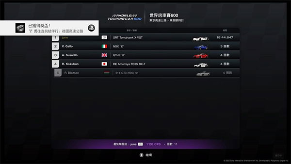 达到600 公里每小时的速度。(照著奖杯做即可,选择SRT Tomahawk X Vision Gran Turismo)