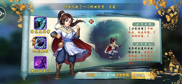 在一开场选择人物的时候就需要玩家选择一次武功绝学,一共有三个武功绝学供玩家选择。一个是能够在前排抗住伤害的武功绝学,一个是非常灵活能够全场来回跑动的武功绝学,还有一个伤害比较高的武功绝学,这三个武功绝学各有春秋。