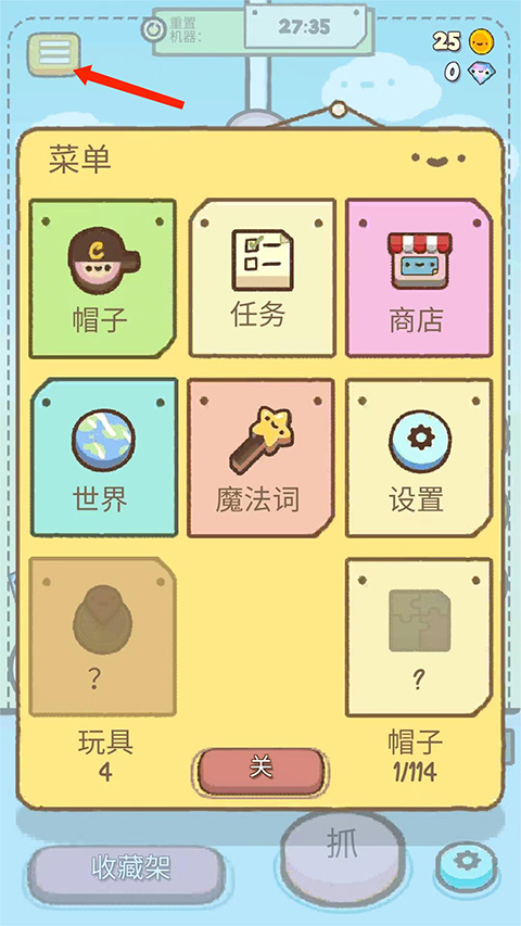 7、选择左上角【三条杠】图标,进入菜单界面,包括【帽子】、【任务】、【商店】、【世界】、【魔法词】、【设置】等选项,
