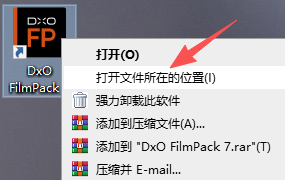 12、鼠标右击DxO FilmPack软件图标,点击【打开文件所在的位置】。