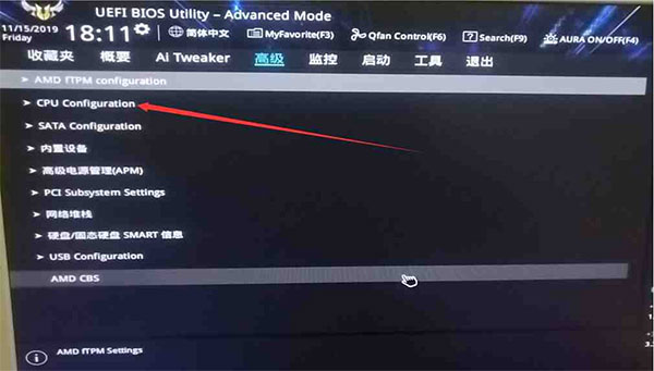 注:如果您的电脑处理器為 AMD CPU,进入BIOS页面后,同样在CPU设定(CPU Configuration)中找到“Secure Virtual Machine”/“SVM mode”这个选项,把“Disabled/关闭”改为 “Enabled/开启”,最后按下F10,保存退出即可。