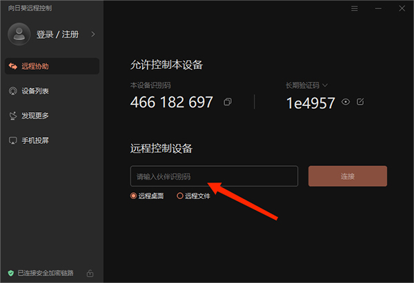 1、打开向日葵电脑版件,查看左下角,确保已连接安全加密链路,