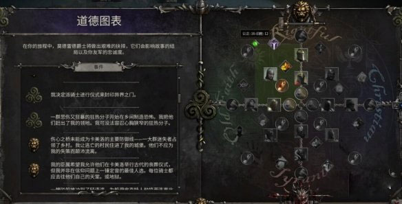 本游戏厂商与战锤审判官殉道者同出一脉,因此继承了其道德系统,但与之不同的是,本作非线条式的选择,而是四象限的、面式的选择。