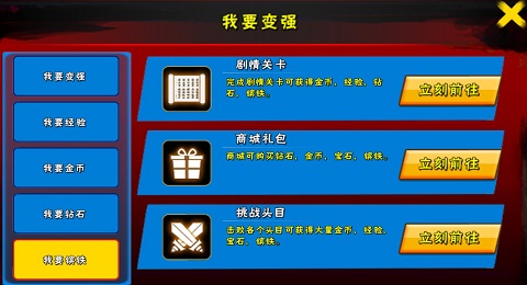 1、剧情关卡:完成剧情关卡可获得金币、经验、钻石、镔铁。