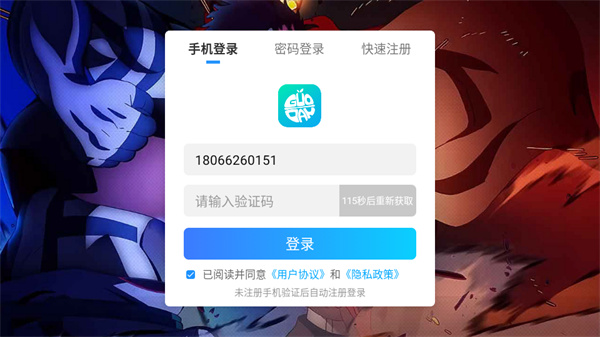 1、首次进入游戏,我们需要进行游戏登录操作,小编建议在这里直接利用手机一键验证码登录操作,能够省去不少麻烦。