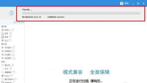 2、软件开始扫描之后就会开始对手机里面的数据进行扫描,然后等待软件的扫描完成就可以在软件的界面上看到已经扫描出来的数据了,扫描的时间长度跟手机里面数据有关系,也就是手机数据越多扫描时间越长。