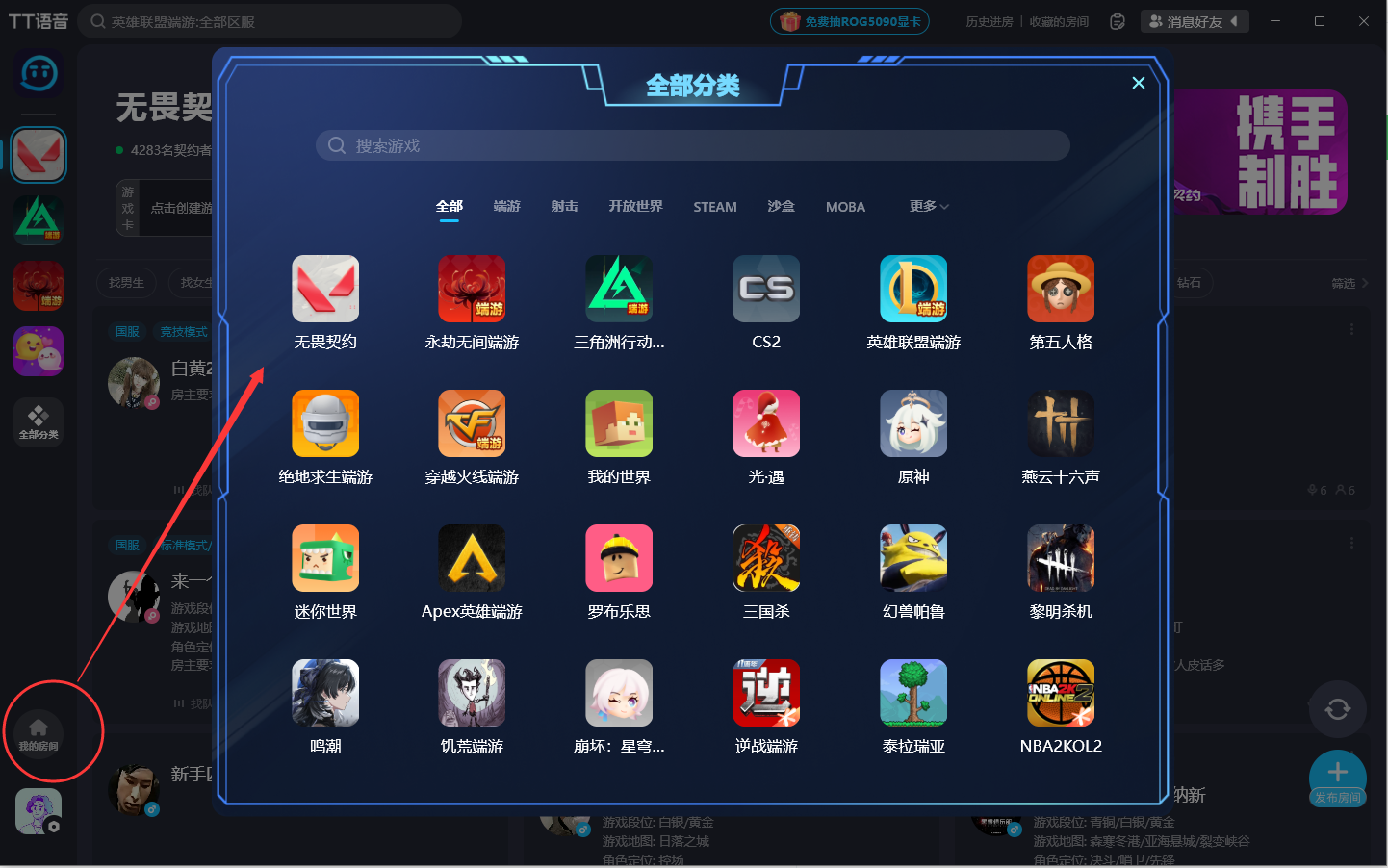 登陆TT语音账号后,在首页的左下角点击“我的房间”。如果已有房间,则会直接进入房间,如果没有加入房间,则可以选择游戏后进入大厅。