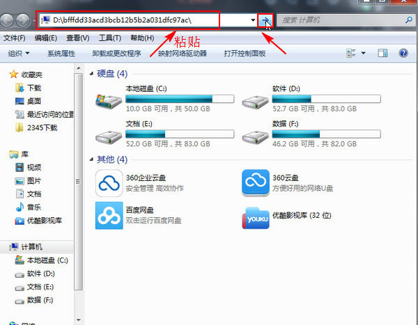 6、同样打开电脑桌面上的“计算机”,把刚刚复制的地址粘贴到下图所示的位置,粘贴快捷键:Ctrl+V。粘贴后点击后面的“转到”按钮。