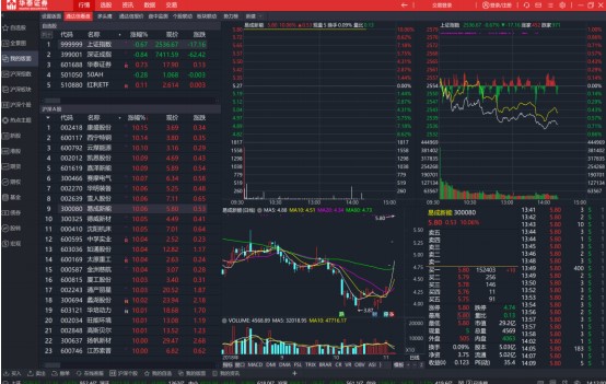 在我的版图界面,可以通过点击上方的功能选项设置我的版面面版,也支持查看特色数据,方便选择股票查看行情数据。当选中一只股票时,可以在同一面版中查看该股票的日 K,分时、与大盘的对比、五档买卖盘数据等。同时还可以查看各种指标数据。