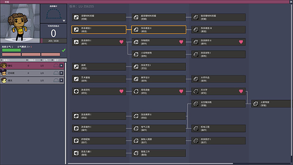研究:在研究中心工作,从而解锁新的技术。学习属性会对这个工作造成影响。