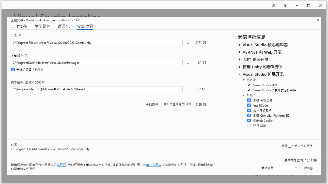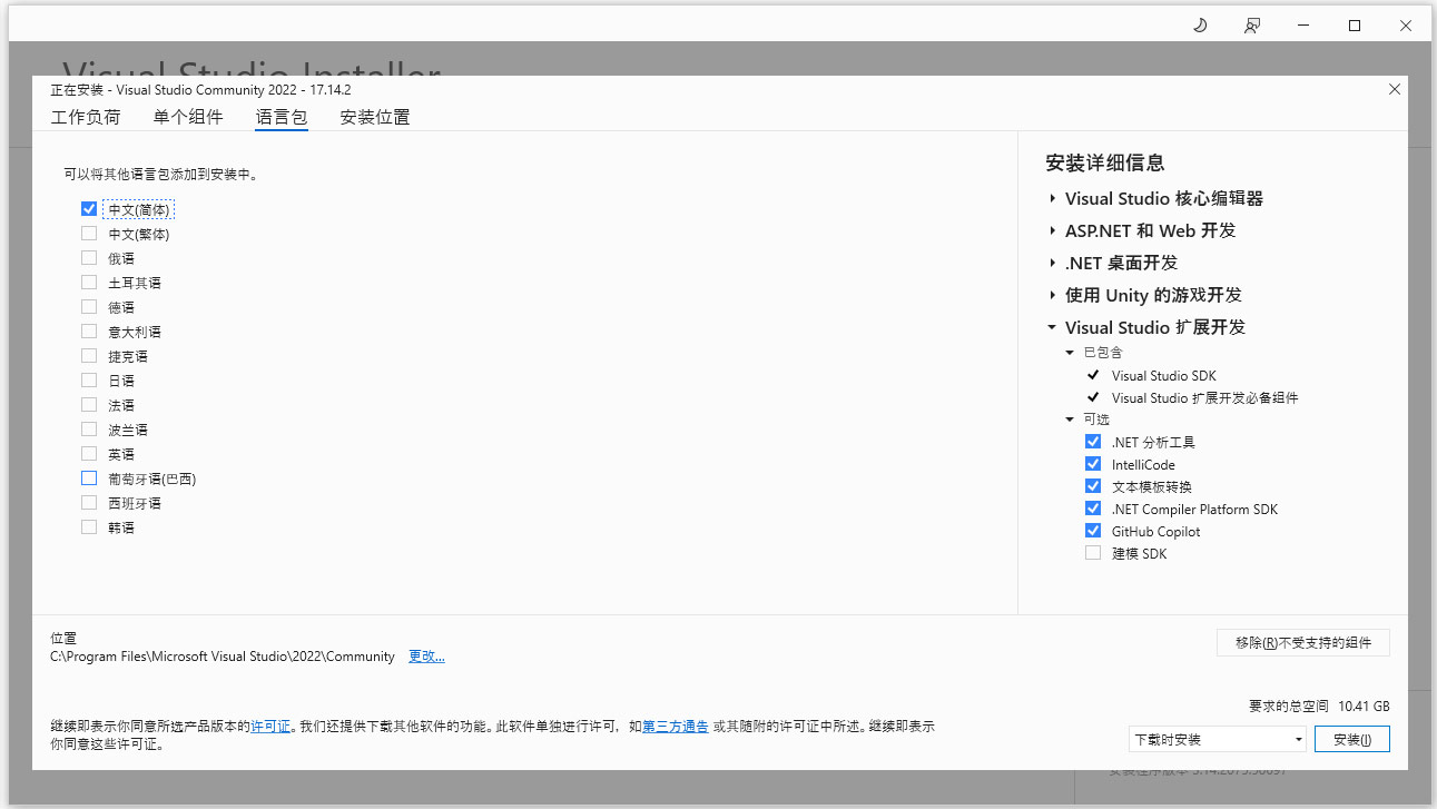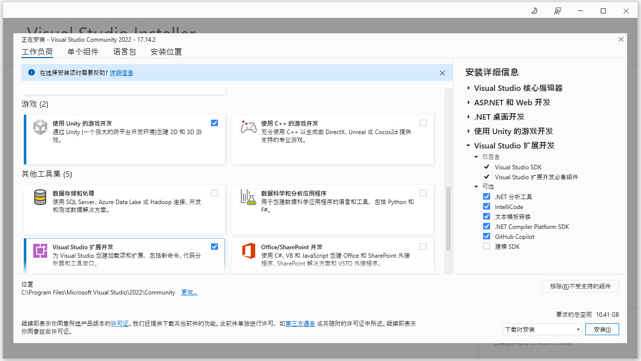 - 勾选“Visual Studio扩展开发”(插件开发)