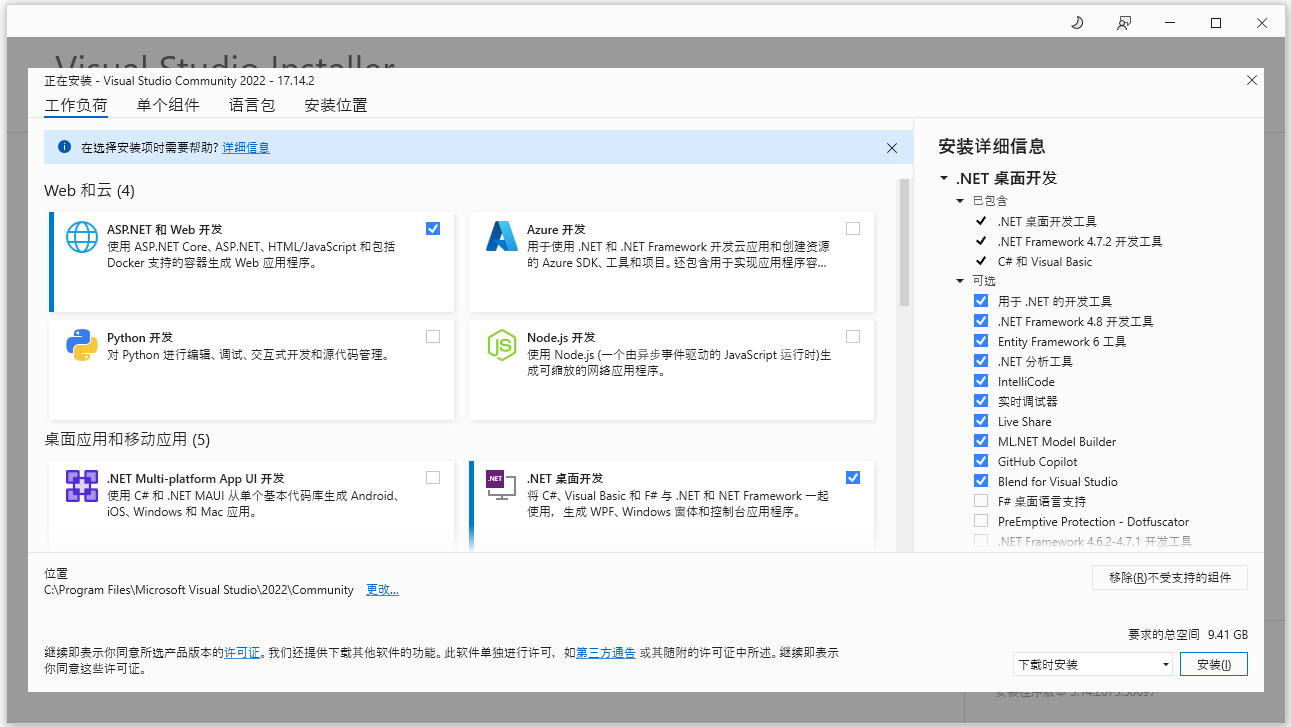 - 桌面应用开发:勾选“.NET桌面开发”或“使用C++的桌面开发”