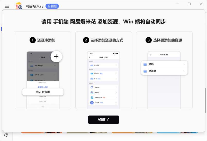 2、登录后在手机端网易爆米花添加资源,Win 端将自动同步