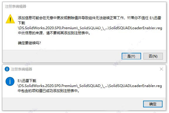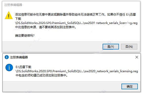 5、再双击sw2020_network_serials_licensing.reg添加注册表,点击是;