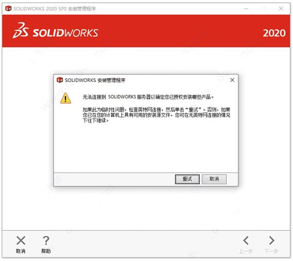 7、用虚拟机加载或用winrar解压SolidWorks.2020.SP0.Full.Premium.DVD.iso镜像文件,以右键管理员身份运行Setup.exe开始安装软件,出现无法连接,直接点击取消按钮;