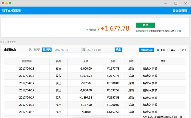 安全专业的财务管理,资金随时提现,精细的流水方便财务对账
