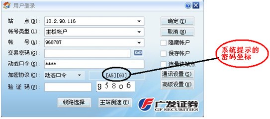 广发口令卡的背面印有5*8矩阵,共40格,每一格印有2位数字,每一个卡对应唯一的序列号,因此,每一个口令卡所印制的数字均不相同。只要经过简单的将口令卡跟用户帐号绑定操作并开通帐号后,登陆系统会随机指示两个座标,正确输入相应位置数字后才能进入系统。