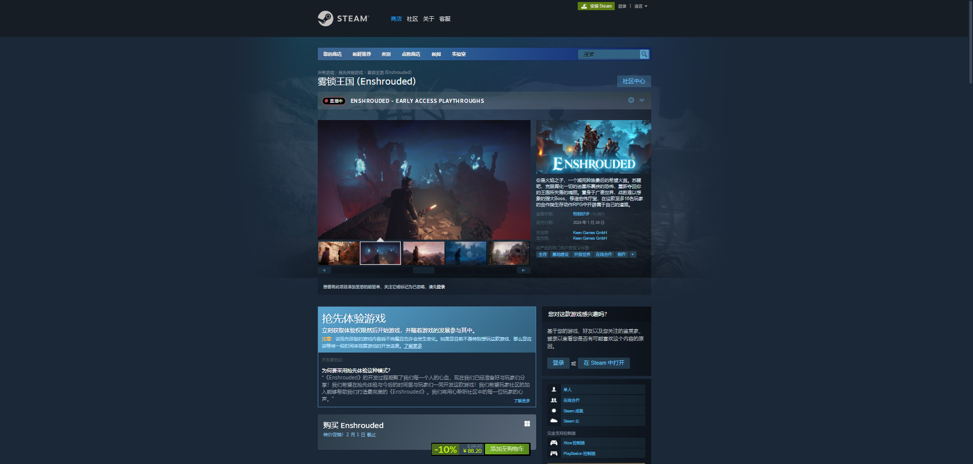 《雾锁王国》的价格为98元人民币,当前处于首发9折促销期间,折后价格为88.2元,这个促销活动将持续到2月1日结束。