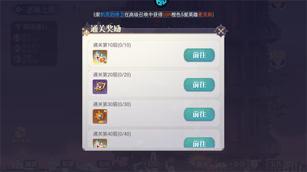 1、恶魔之塔首通可获得进阶石奖励整10层额外领取一份通关奖励。