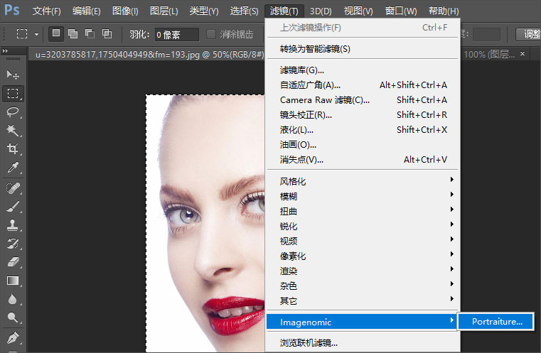 3、打开ps软件,依次点击滤镜--imagenomic--portraiture;