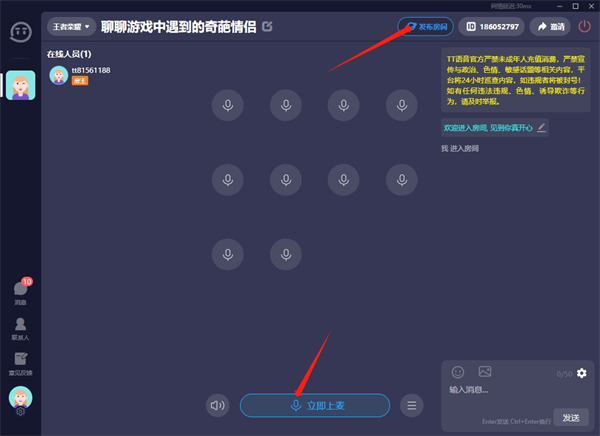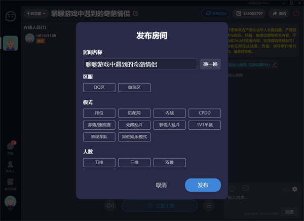 3、输入你发布的房间名称、区服、模式、人数等需求,最后点击发布;