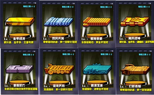 跳板选择随着金币及钻石的增加可以开启更多的跳板,跳板升级同样会有相应的属性增加,不同的跳板基础属性及样式也是不一样的(每快跳板的等级上限和外观造型是不一样的哟)目前游戏内有10快跳板供玩家选择