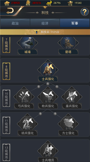 在军事科技,你可以强化部队的防御和进攻,强化每个兵种的属性和兵量上限。