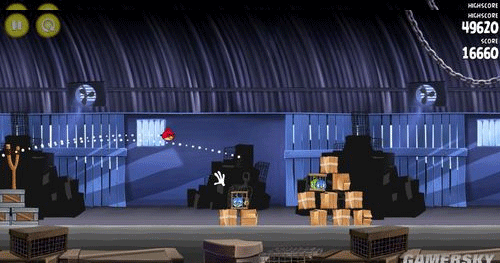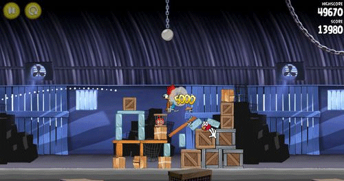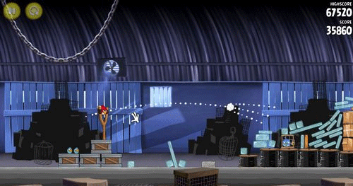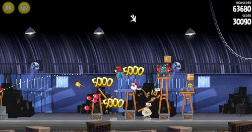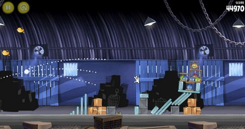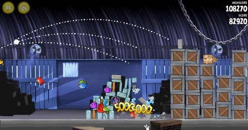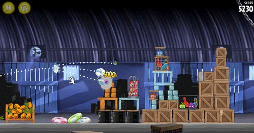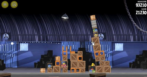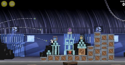 这一关也是如同前面。让小鸟散射摧毁前面的两个建筑物;然后让剩余的物件在推到最右边的建筑物
