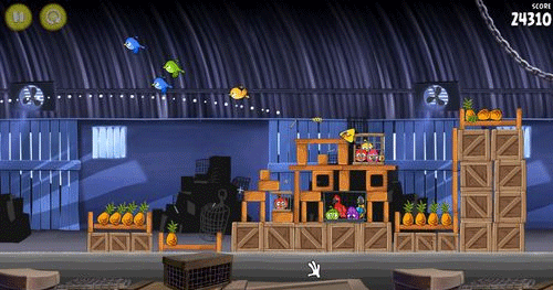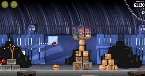 本关会开启新的黄色小鸟。这种小鸟虽然极其神速,但碰到石壁和玻璃墙时的攻击力仍然有限。用这种小鸟进攻木头壁垒简直像捅破一层纸一样好用,这样你就可以闪电袭击敌人,让它们葬身于堡垒的废墟之中。而且在发射之后你还可以按一次鼠标左键进行加速攻击,这一关很简单,如下图。攻击左边建筑物的中间部位;然后让其连串的倒下即可。右边的石头会自动帮助你摧毁剩余的物件