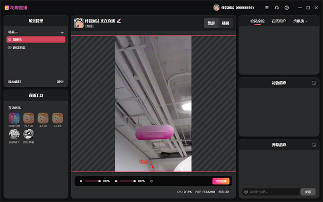 调整后摄像头画面反而挡住了游戏,这时可以通过拖拽“锚点”缩小摄像头画面,并通过拖拽摄像头视频画面进行位置的调整,调整完摄像头画面的位置大小就完成了弹幕游戏开播前的准备工作