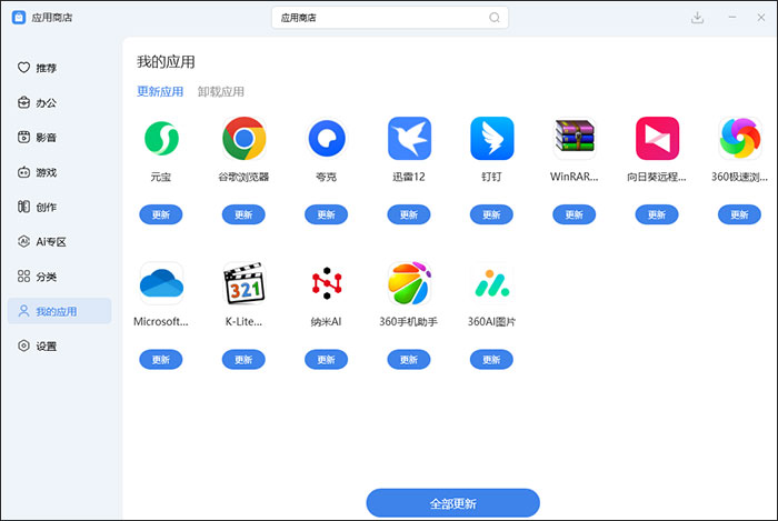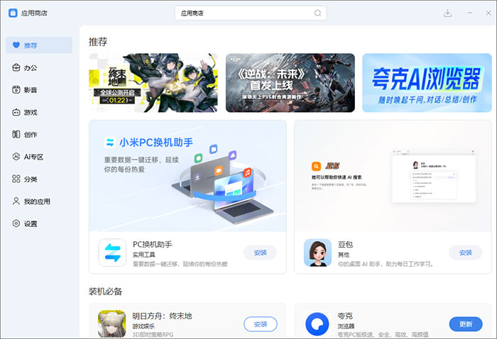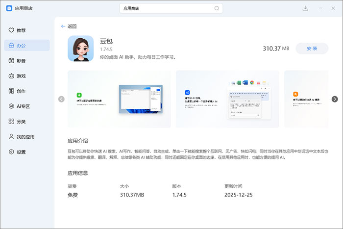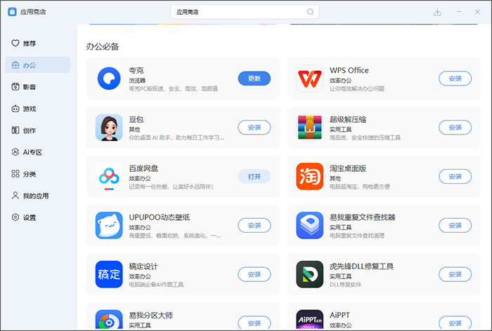 2、整个软件很简单,没有多余的内容。最上方是软件搜索框,左侧栏为软件分类区,商店将软件根据功能分为了办公、影音、游戏、创作多个版块;