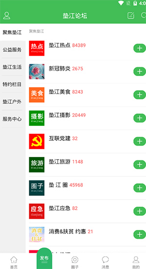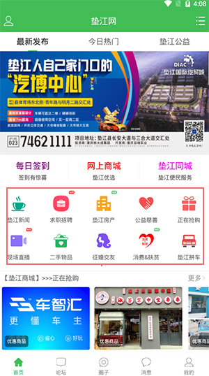 1、在本站下载安装垫江论坛app,在手机上运行,可以看到有首页、论坛、圈子、消息、我的五个板块;2、在首页,可以查看垫江新闻、求职招聘、垫江房产、征婚交友等;