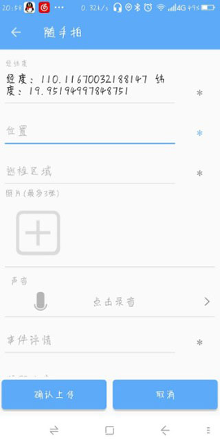 5、以此填写村委会位置、巡查区域、工作的照片、事件详情等,点击确认即可。