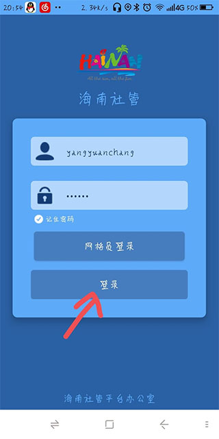 1、打开海南社管app,输入账号和密码,点击登录;