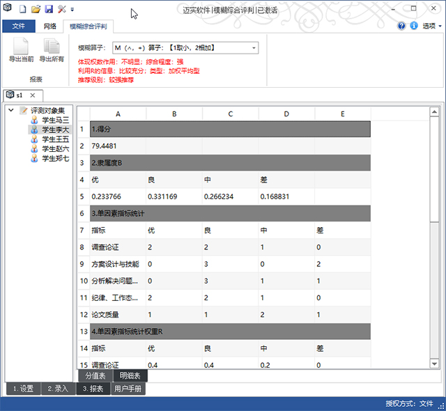 迈实模糊综合评判软件可为使用者提供汇总表,分值表,隶属度矩阵B,单因素指标统计权重R,指标间权重A等等各种所需的过程数据,方便使用者对这些过程数据的后续文档操作。