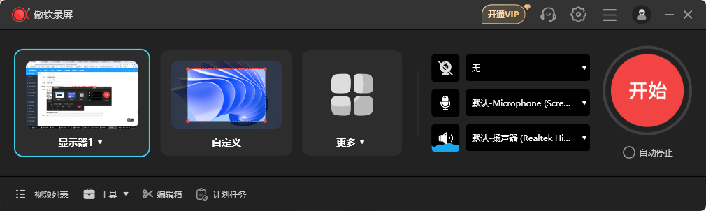 1、打开傲软录屏电脑版,进入应用主界面,我们设置好系统声音后点击右边【开始】按钮,便会进入录屏界面,