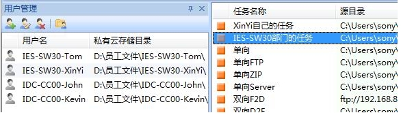 举个例子,如上图所示,有这些各个部门的用户。当前选中的用户"IES-SW30-XinYi"具有右边这些任务,部门"IES-SW30"的所有用户都具有右边选中的这个任务。现在我们需要通过管理端让部门"IES-SW30"所有用户的这个任务执行一下,我们可以通过最上面的这个对话框,在用户名称栏里输入"IES-SW30-*",任务名称栏里输入"IES-SW30部门的任务"。如果您要让所有用户的所有任务执行一下,只需要在两个名称栏里都填上'*'。