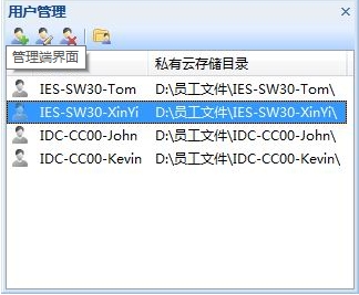 多用户版管理端主要功能是进行用户身份验证和一些信息的查看,它可以查看所有工作端的设置和任务执行情况。管理端界面和信息窗口基本和完整版一样,只是多了一个用户管理窗口如图所示。管理窗口上方四个按钮分别是"新建用户","修改用户信息","删除用户","打开用户云存储所在的文件夹",窗口中列出了所有用户及用户是否在线的状态。选中某个用户,就能在其它窗口中看到该用户建立的任务和执行日志等信息。并可以通过菜单中的选项查看该用户的其它的一些配置信息。
