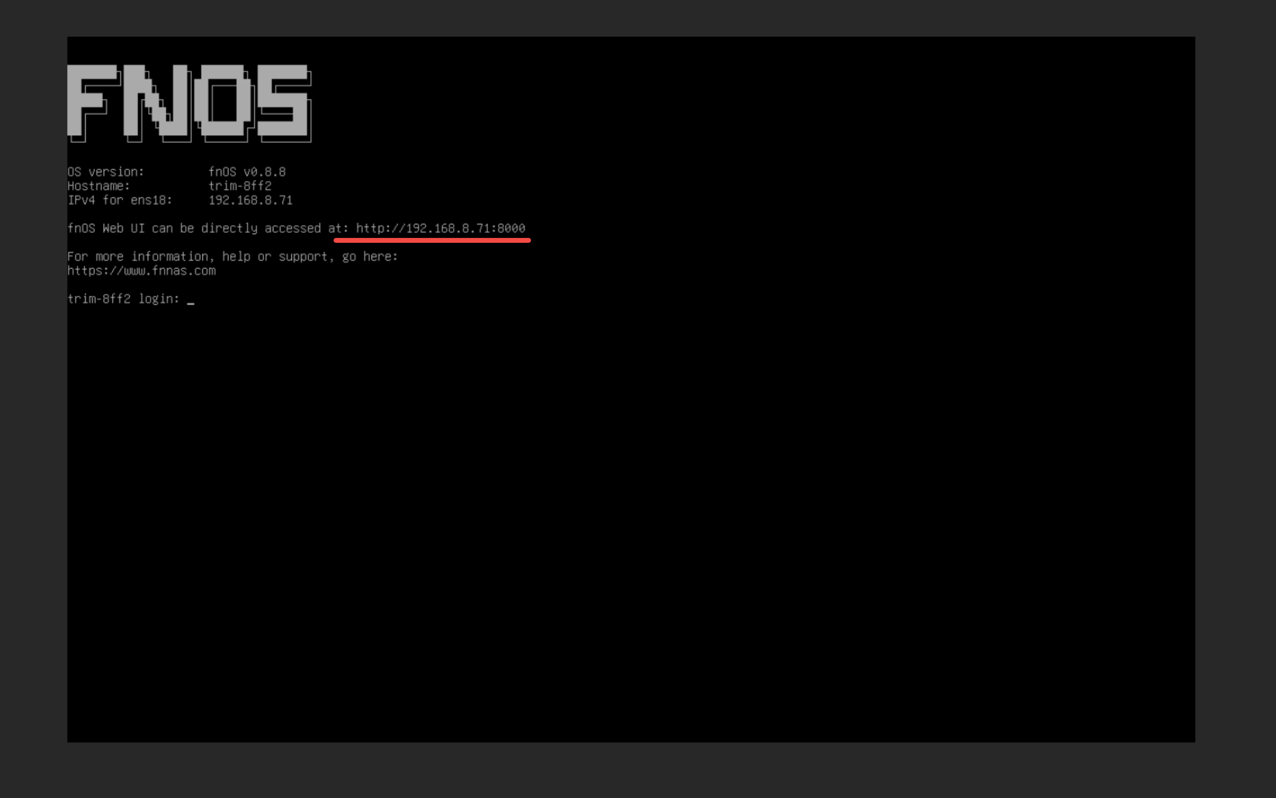 设备重启成功后将自动进入终端登录页,这意味着系统已成功安装并启动!请记住所设置的 IP 地址,接下来你将通过浏览器访问此地址来设置和使用 fnOS。现在你可以将显示器、键盘、鼠标从主机上拔除了。