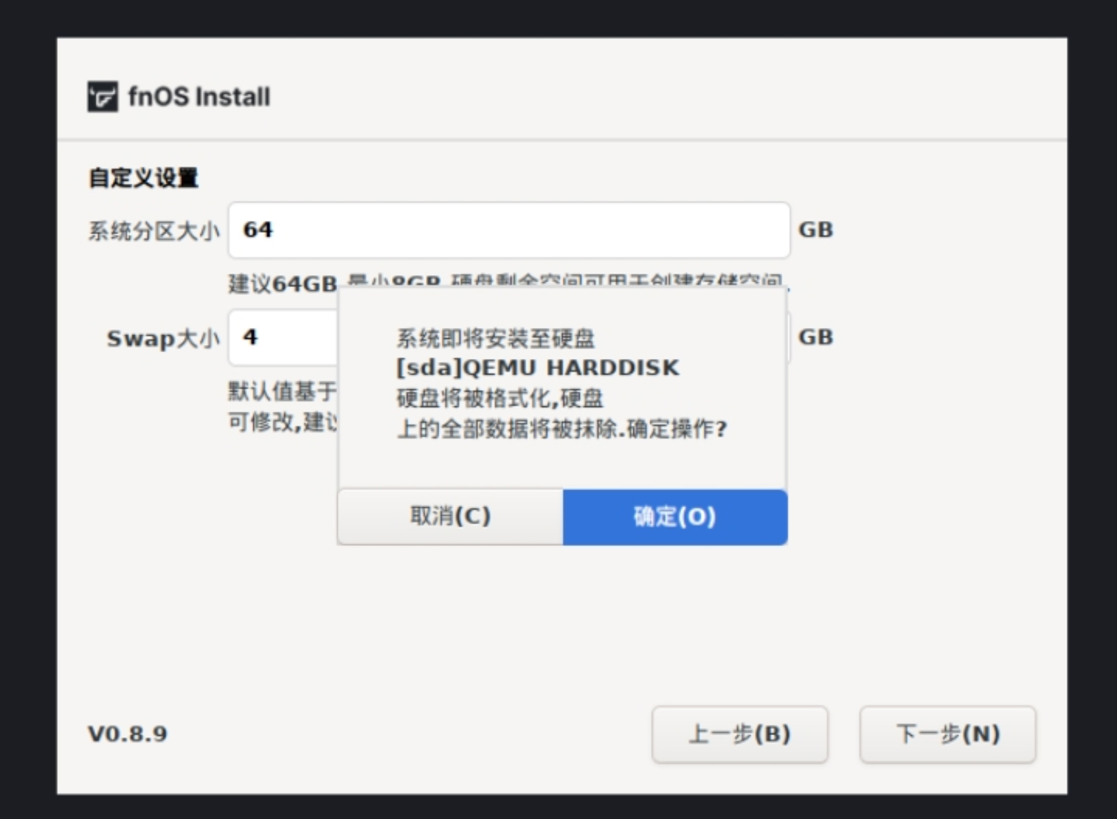 在系统盘容量充足的情况下,建议系统分区设置为 64 GB。如安装在虚拟机下,可按情况适当减小。Swap 分区大小已按物理内存大小计算推荐值,可按硬件情况自行调整。