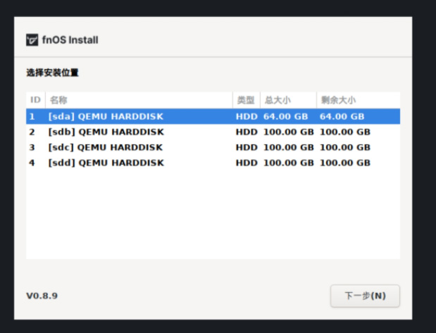 注意:在飞牛fnOS 上,系统将只安装在一块硬盘中。系统盘除系统分区以外的空间,可用于创建存储空间安装应用和存储文件。建议根据需要选择合适容量的 SSD 作为系统盘。