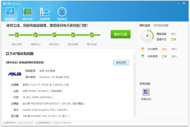 3、硬件检测:可以查看电脑概览,硬件健康,处理器信息,主板信息,内存信息等;