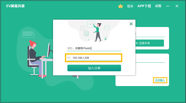 若未自动查找到屏幕共享设备,可以通过手动输入【共享端IP地址】加入分享