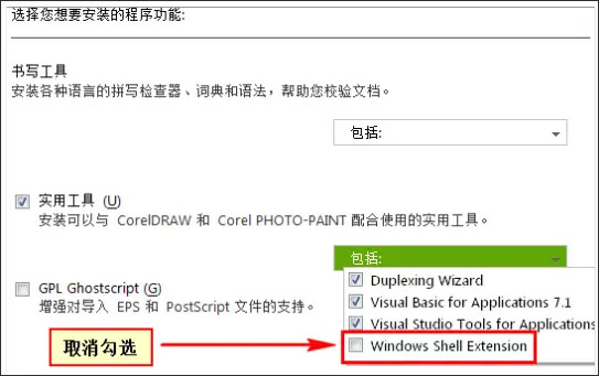 那么你就需要选择“自定义安装”,并且取消“Windows Shell Extension”组件(Windows Shell Extension为croeldraw缩略图组件,出现上图的情况,大多数因为你电脑安装过其他版本的CDR软件造成冲突的原因)。