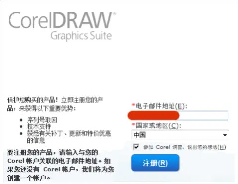 6、如果你打算购买CorelDRAW X7序列号,享受正版服务,可以注册一个Corel账号。如果只是想试用一下,可以在电子邮件地址那里随便输入一个邮件地址(只要邮件格式正规即可)。