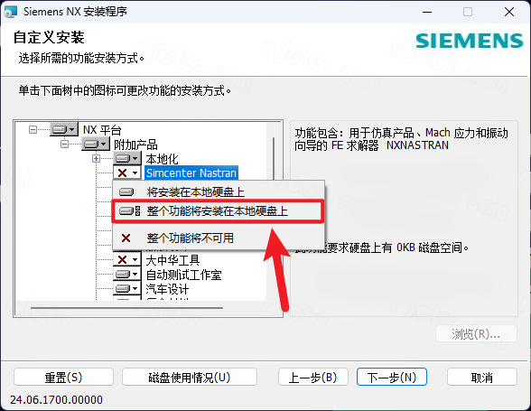 9、依次点击下图本地化下方-前方有红色“X”图标的项目,选择【整个功能安装在本地磁盘上】